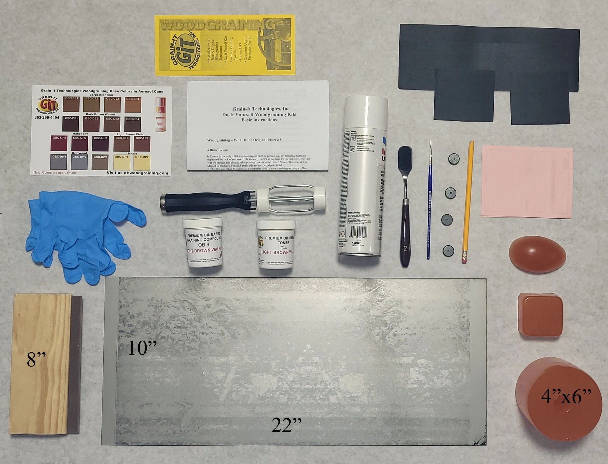 One 10"x22" Large graining plate of your choice. One Transfer roller - 4" x 6" One 8" Doctor Blade One Graining compound of your choice. One Corresponding toning compound. All associated tools and Instructions.